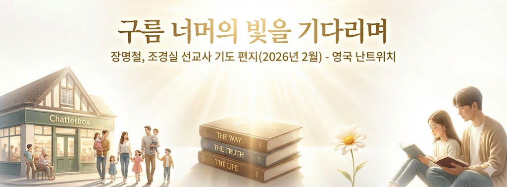 주님의 인도하심을 따라 이곳을 지키고 있지만, 때로는 한국의 예배 공동체와 동역자분들이 너무나 그리워 정서적인 갈증이 찾아오기도 합니다. 이번 7 월 초부터 약 한 달간, 조경실 선교사는 영국에 남아 이곳의 영혼들을 계속해서 돌보고, 장명철 선교사 홀로 잠시 고국을 방문하려 합니다. 멀리서나마 눈물로 기도하고 있는 고국의 교회와 학교가 오직 주님의 평강으로 회복되기를 간절히 소망합니다. 이번 방문이 갈등의 한복판이 아닌, 오직 동역자 여러분을 위로하고 재충전하는 복된 시간이 되길 기도 부탁드립니다.