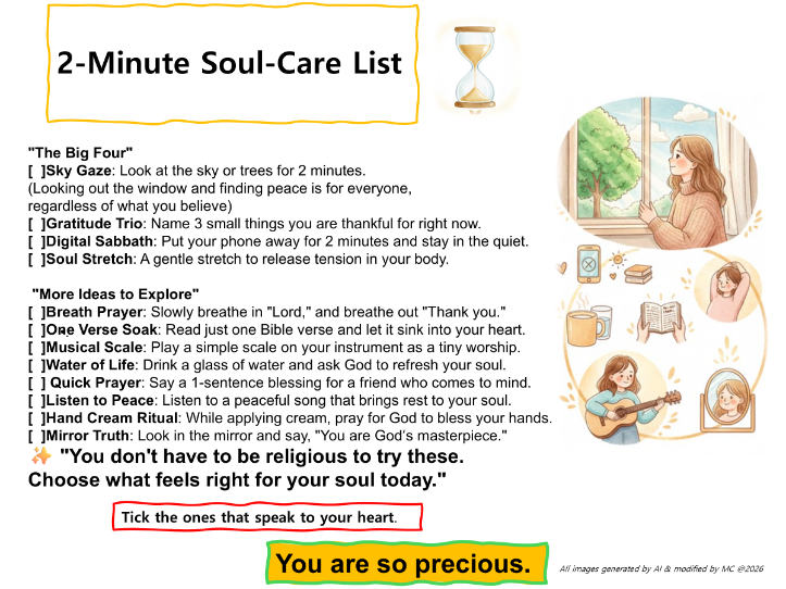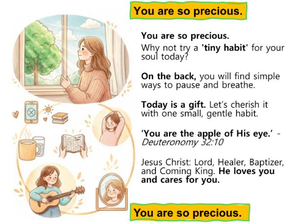 조경실 선교사는 이곳에서 구약의 오벳에돔처럼 묵묵히 사역의 자리를 지키고 있습니다. 영아 사역과 대학 사역(Rooted)에 온 학생들을 생각하며 '2 분 영혼 돌보기 리스트(2-Minute Soul-Care List)'를 만들어 나누어 주었는데, 예상보다 반응이 훨씬 좋았습니다. 현재는 캠퍼스 전도용으로 인쇄하여 학생들에게 전하고 있으며, 교인들에게도 나눔을 이어가고 있습니다.